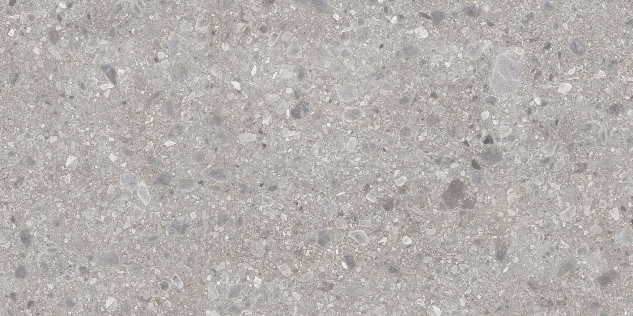 Este modelo se inspira en el terrazo de tonos grises. La decoración en masa Full Body añade sutilmente altos y bajos relieves a las pequeñas piedras dispersas, aportando carácter a todo el tablero.